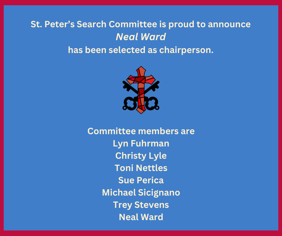 To our St. Peter's parish family, thank you all so much for your participation and engagement in this critical part of our rector search. Our high rate of return on the survey gives us a solid foundation to assess our needs and desires moving forward. Below you’ll find links to several important documents about the search as well as our parish profile. Please take your time to review the documents as you’re able.