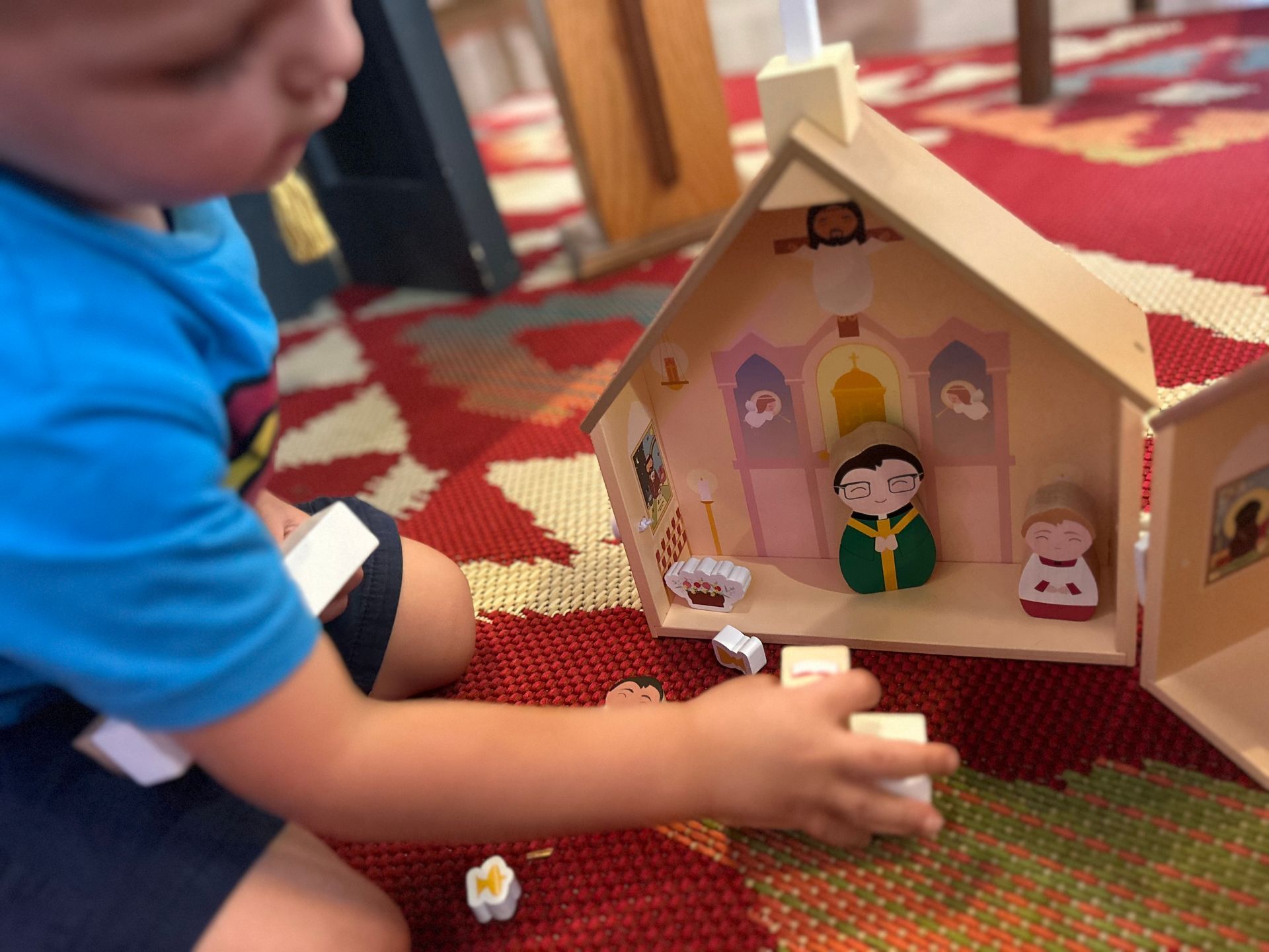 A section of the church will be set up as a beautiful children’s chapel in which children ages 6 and younger are invited to participate in the worship service with activities designed for them. The chapel will be staffed each week at the 10:30am service by 1-2 adults and 1-2 youth who will help facilitate and engage the children in worship through a combination of guided activities and free play. All toys and activities will be centered on the liturgy and prayer. Parents will have the option of joining their children in the chapel or sitting elsewhere in the church. Aesthetically, the chapel itself will be intentionally designed to reflect the beauty of the rest of the church. It will have a children’s altar that reflects the high altar, a baptismal font, wooden play communion sets, children’s vestments, a table, etc. When possible, the use of plastic will be avoided, opting instead for earthy, sacred designs. The goal is not simply to entertain children while adults worship, but to invite children into worship in ways designed for them.